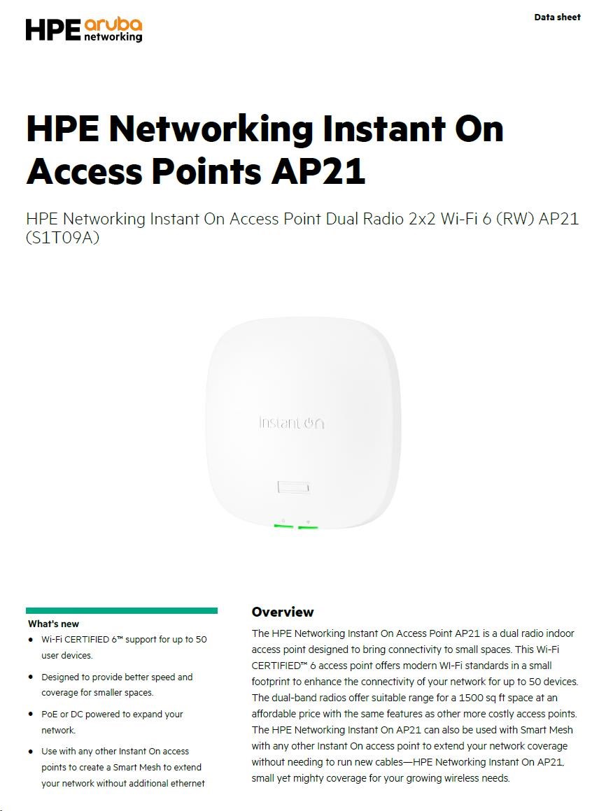 • The HPE Networking Instant On Access Point AP21 is a dual radio indoor access point designed to bring connectivity to small spaces. This Wi-Fi CERTIFIED™ 6 access point offers modern WI-Fi standards in a small footprint to enhance the connectivity of your network for up to 50 devices. The dual-band radios offer suitable range for a 1500 sq ft space at an affordable price with the same features as other more costly access points. The HPE Networking Instant On AP21 can also be used with Smart Mesh with any other Instant On access point to extend your network coverage without needing to run new cables—HPE Networking Instant On AP21, small yet mighty coverage for your growing wireless needs.