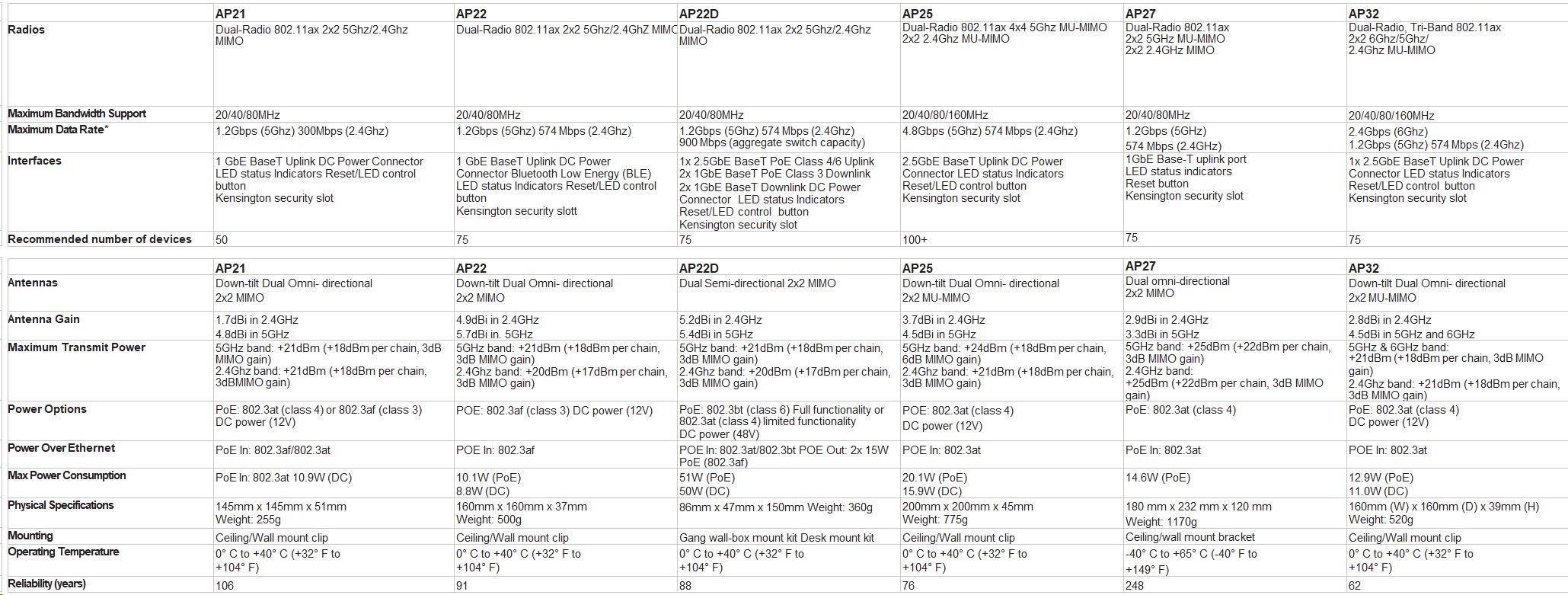 The HPE Networking Instant On Access Point AP21 features Orthogonal Frequency-Division Multiple Access (OFDMA) which allows them to handle multiple Wi-Fi 6 capable clients on each channel simultaneously; this improves efficiency by boosting overall capacity and reducing latency. Target Wake Time (TWT) – Ideal for IoT devices that communicate infrequently, TWT establishes a schedule for when clients need to communicate with an AP. This reduces power consumption and can extend the battery life of clients. Multiple Input, Multiple Output (MIMO) – Allows the access point to serve multiple clients (Wi-Fi 5 and Wi-Fi 6) simultaneously.