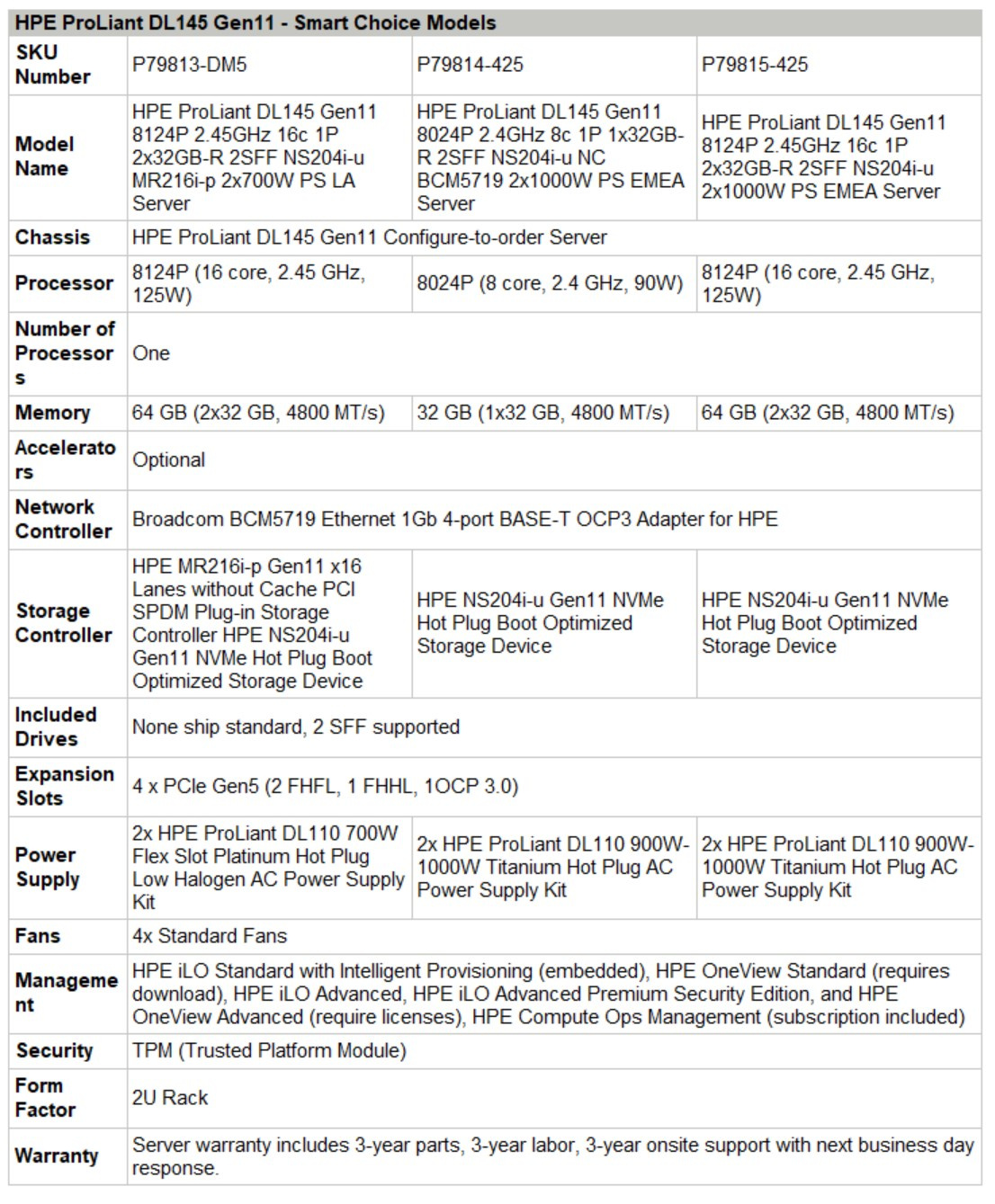 | Technical specifications | HPE ProLiant DL145 Gen11 8124P 2.45GHz 16c 1P2x32GB-R 2SFF NS204i-u 2x1000W PS EMEAServer |