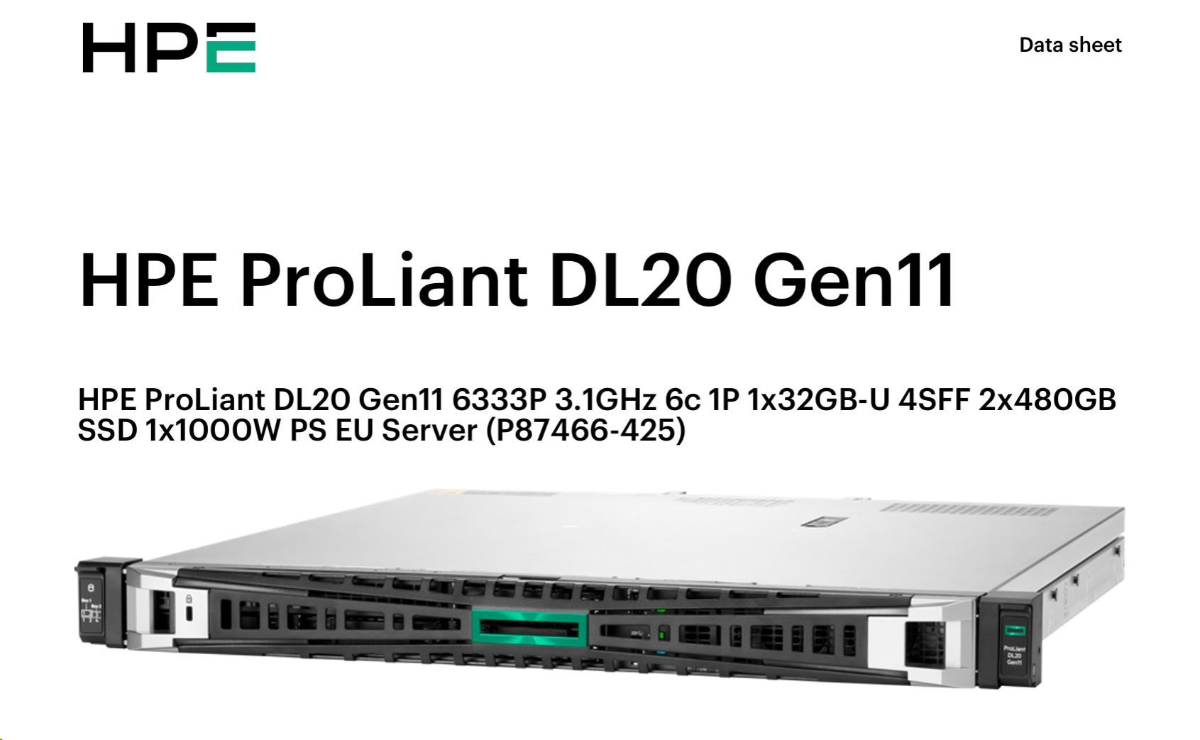 HPE PL DL20 gen11 6333P (3.1G/6C12T) 1x32G 4SFF 2x480GB VROC 1x1000W 4x1G NBD333 Smart Choice.