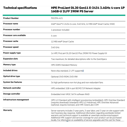 HPE PL DL20g11 E-2434 (3.4G/4C) 16G 2LFF-HP 290W.
