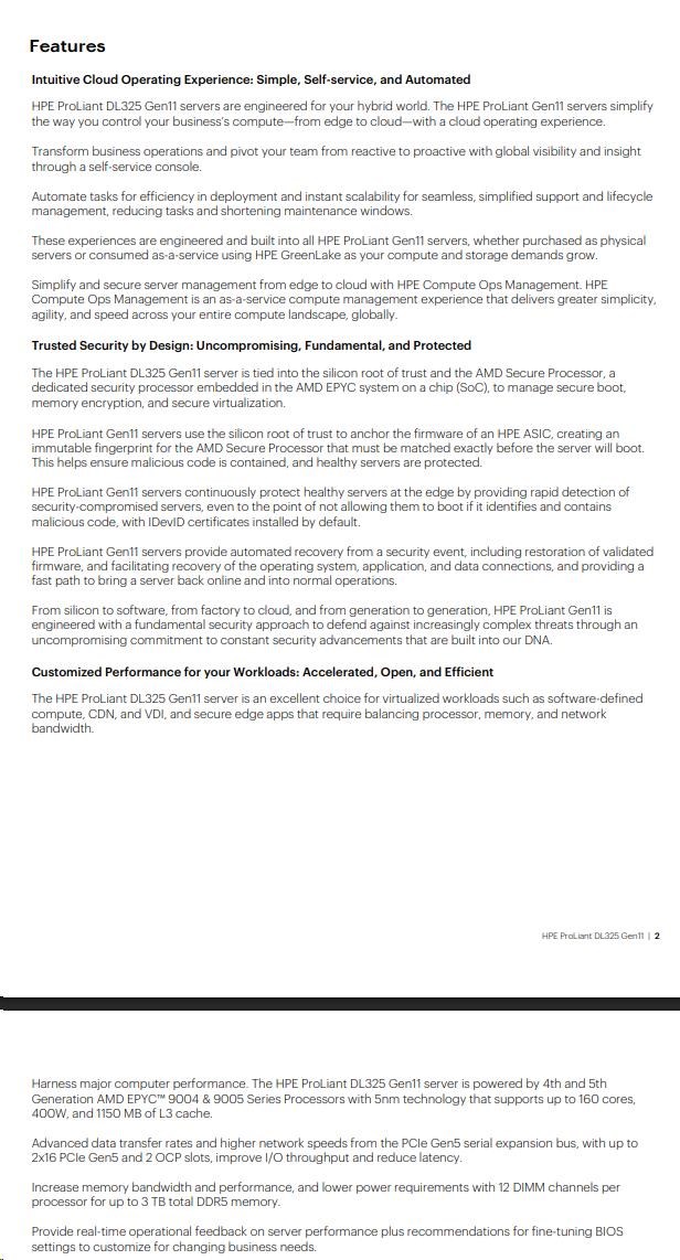 | Management | Default: HPE iLO Standard with Intelligent Provisioning, HPE OneView Standard (requires download) |