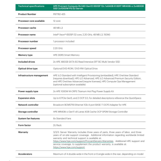 HPE PL DL320 Gen12 6505P (2.2/12C) 1x64G (P69728) 2x480G MR408i-o 8SFF 2x1000W 1GbE NBD333 Smart Choice.