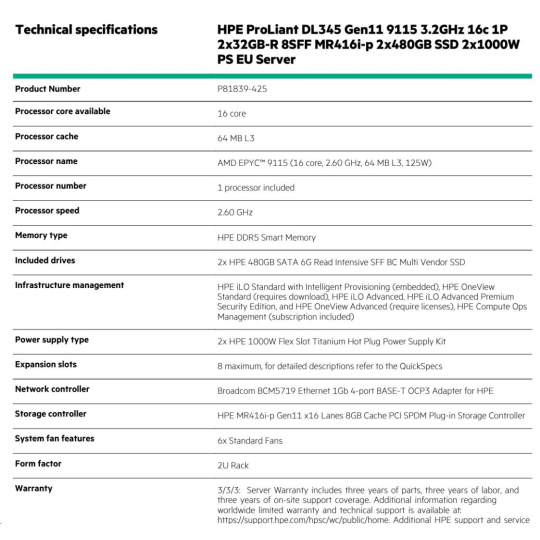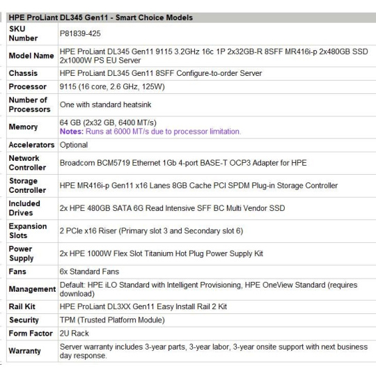 HPE PL DL345g11 AMD Epyc 9115 (2.6G/16C) 2x32G 2x480G (P40497) 2x1000W MR416i-p 8SFF 4p1G Smart Choice