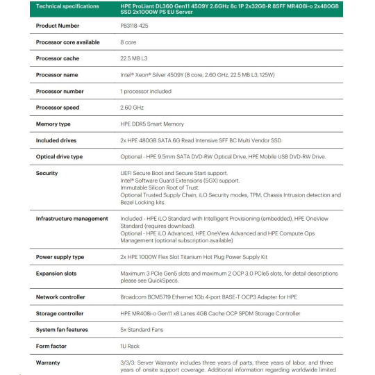 HPE PL DL360g11 4509Y (2.6G/8C) 2x32G (p64706) 2x480G 2x1000W MR408i-o 8SFF 4p1G ocp Smart Choice.