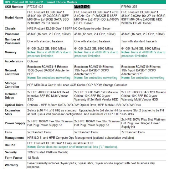 | Model Name | HPE ProLiant DL360 Gen11 4510 2.4GHz 12c 1P 64GB-R 8SFF MR408i-o 2x960GB SSD 2x1000W PS EMEA Server |