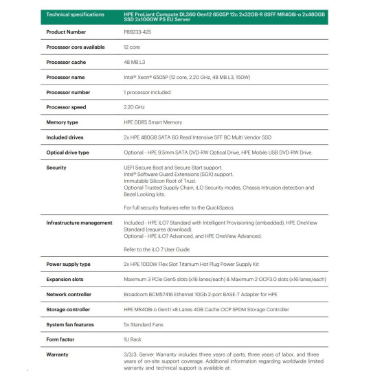 HPE PL DL360g12 6505P (2.2G/12C) 2x32G (P69727) 2x2.4TB MR408i-o 8SFF 2x1000W 2p10GbE NBD333 Smart Choice.