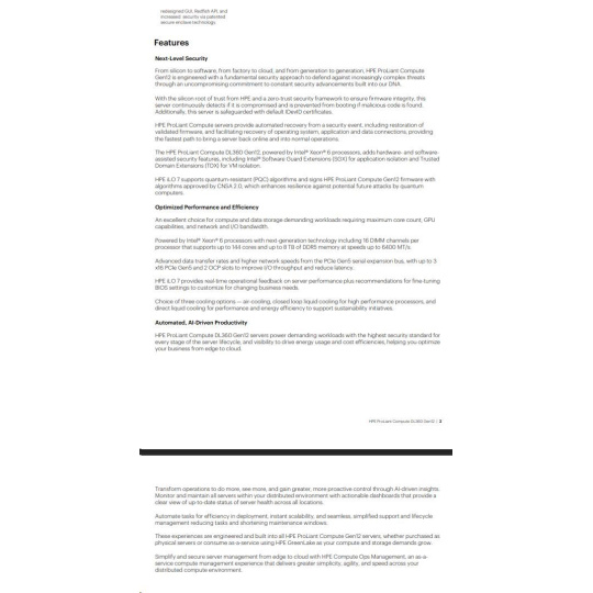 | Management | Included - HPE iLO7 Standard with Intelligent Provisioning (embedded), HPE OneView Standard (requires download). Optional - HPE iLO7 Advanced, HPE OneView Advanced, HPE Compute Ops Management (optional subscription available). |