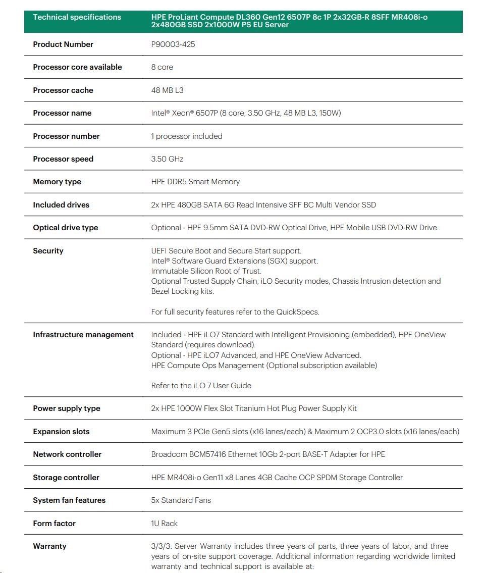 | Model Name | HPE ProLiant Compute DL360 Gen12 6507P 8c 1P 2x32GB-R 8SFF MR408i-o 2x480GB SSD 2x1000W PS EU Server |