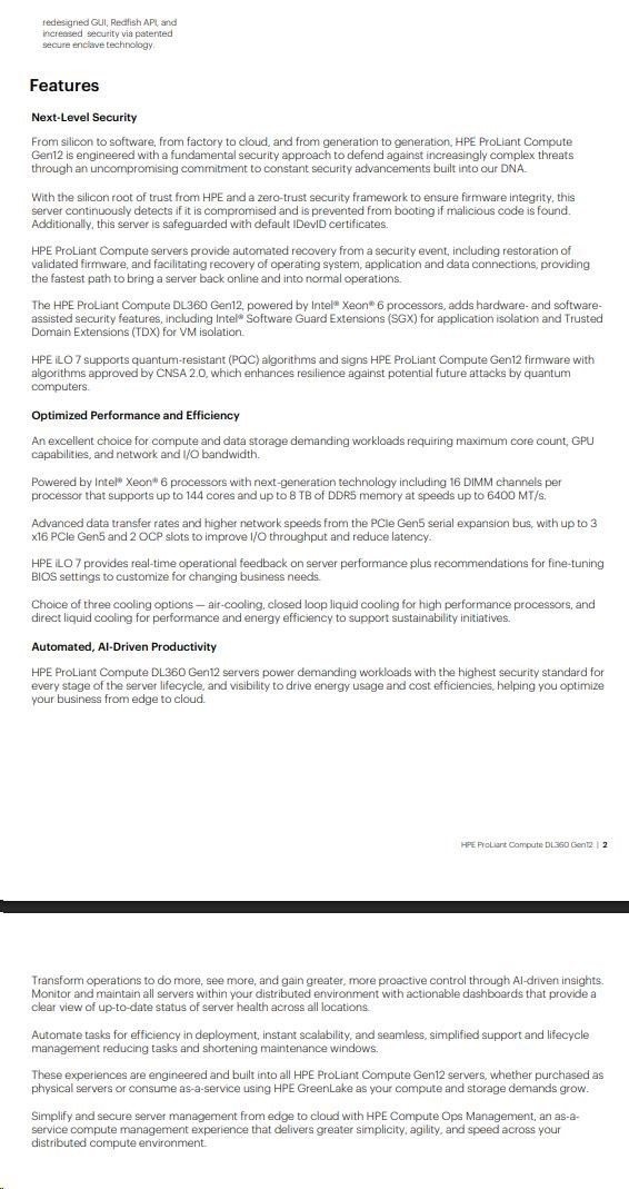 The HPE ProLiant Compute DL360 Gen12 is a compact 1U, two-socket server designed for hybrid cloud workloads. Powered by Intel® Xeon® 6 processors supporting up to 144 cores and up to 8 TB DDR5 memory (up to 6400 MT/s), it delivers exceptional compute performance, scalability, and high-speed data transfer.