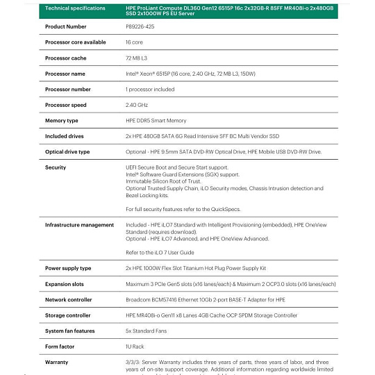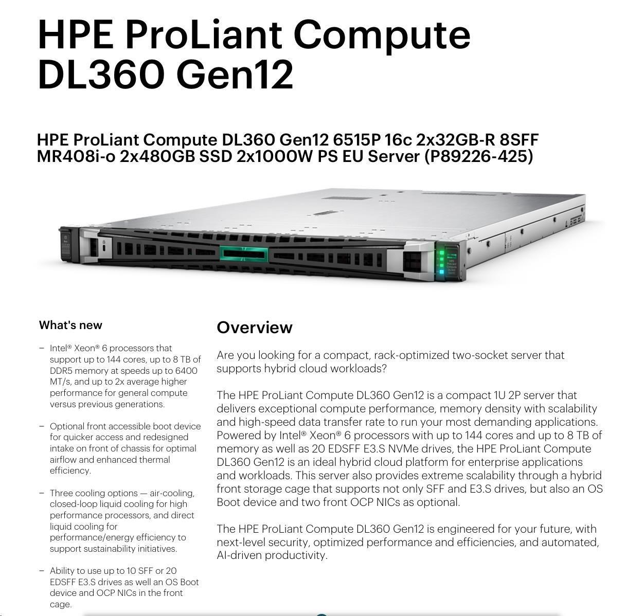 HPE PL DL360g12 6515P (2.4/16C) 4x32G (P69727) NS204i-uv2 MR408i-o 8SFF 2x1000W NBD333 Smart Choice.
