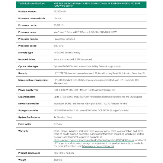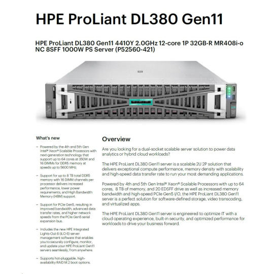 Model Name HPE ProLiant DL380 Gen11 4410Y 2.0GHz 12-core 1P 32GB-R MR408i-o NC 8SFF 800W PS Server