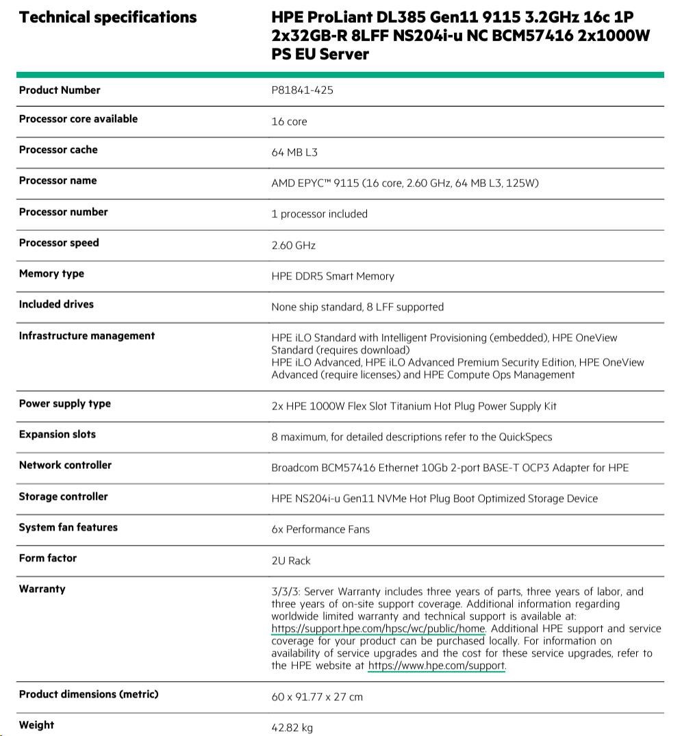 Technical specifications HPE ProLiant DL385 Gen11 9115 3.2GHz 16c 1P 2x32GB-R 8LFF NS204i-u NC BCM57416 2x1000W PS EU