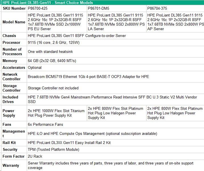 HPE PL DL385g11 AMD EPYC 9115 (2.6/16C) 2x32G (P64985) 1x7.68TB NVMe 2x1000W 8SFF 2p10GT Smart Choice.