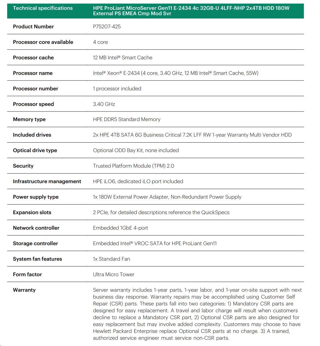| Model Name | HPE ProLiant MicroServer Gen11 E-2434 4c 32GB-U 4LFF-NHP 2x4TB HDD 180W External PS EMEA Cmp Mod Svr |