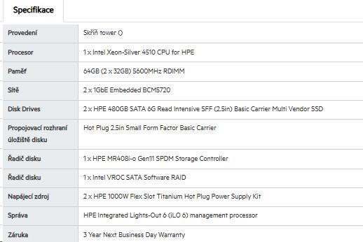 Provedení serveru:Tower; Výrobce CPU:Intel; Maximální počet procesorů:1; Řada procesorů:Intel 12 Core Xeon; SSD Kapacita (GB):480; Model procesoru:Intel Xeon 4510; Velikost paměti RAM (GB):64; Maximální paměťová kapacita serveru (GB):3072; Maximální počet slotů PCIe:5; Maximální počet HDD v serveru:16; Hot-plug cage pro HDD:2.5" SFF; RAID:1, 5, 10, 50.... více