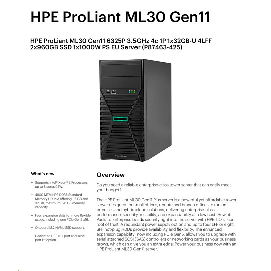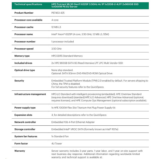 HPE PL ML30g11 6325P (3.5G/4C8T) 1x32G 2x960G SSD SATA 4LFF-HP VROC 1x1000W 4p1G NBD311 Smart Choice.