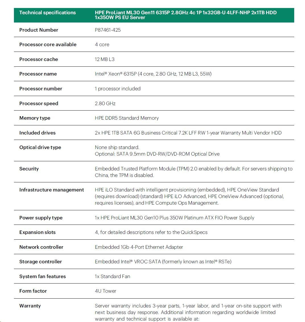 HPE PL ML30g11 6325P (3.5G/4C8T) 1x32G 2x960G SSD SATA 4LFF-HP VROC 1x1000W 4p1G NBD311 Smart Choice.