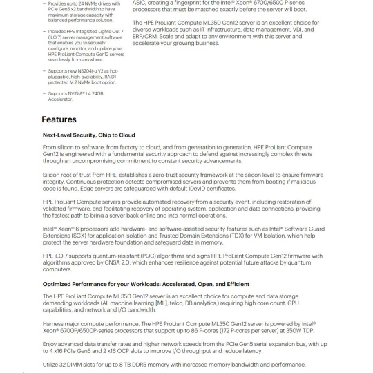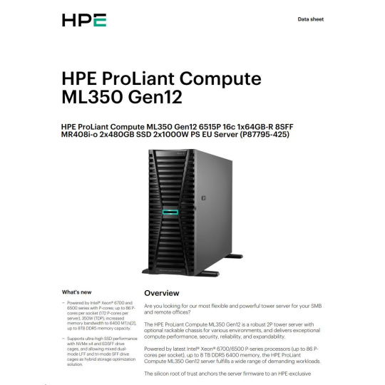 HPE PL ML350 Gen12 6515P (2.4/16C) 1x64G (P69728) 2x480G MR408i-o 8SFF 2x1000W 1GbE NBD333 Smart Choice.