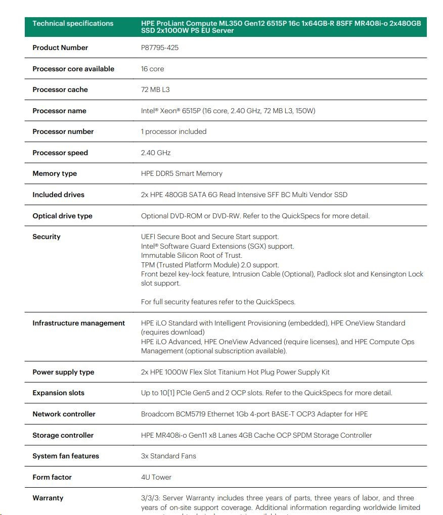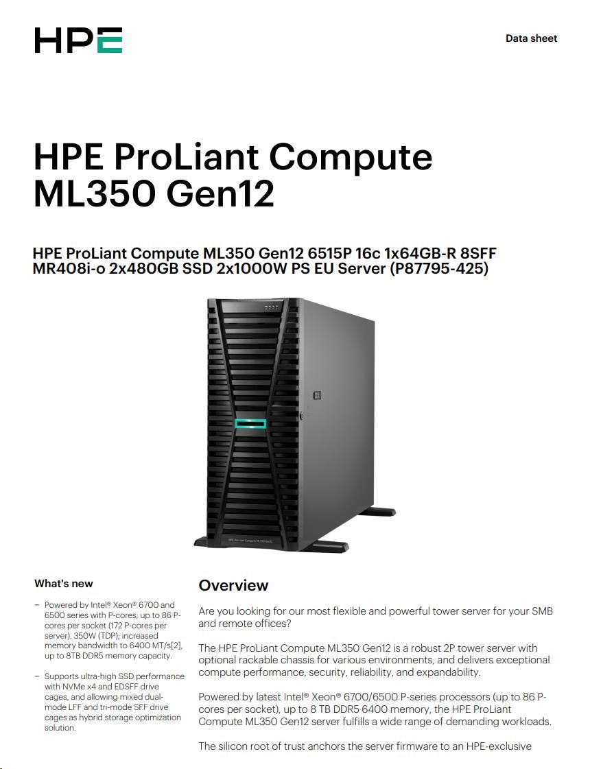 HPE PL ML350 Gen12 6515P (2.4/16C) 1x64G (P69728) 2x480G MR408i-o 8SFF 2x1000W 1GbE NBD333 Smart Choice.