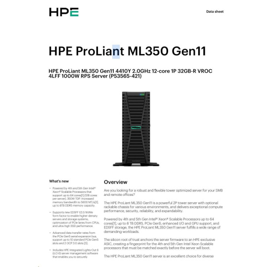 Model Name HPE ProLiant ML350 Gen11 4410Y 2.0GHz 12-core 1P 32GB-R VROC 4LFF 1000W RPS Server