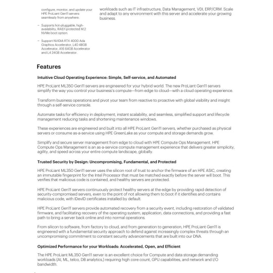 | Management | HPE iLO Standard with Intelligent Provisioning (embedded), HPE OneView Standard (requires download); HPE iLO Advanced and HPE OneView Advanced (require licenses) |