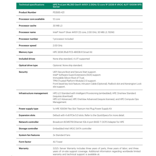 | Model Name | HPE ProLiant ML350 Gen11 4410Y 2.0GHz 12-core 1P 32GB-R VROC 4LFF 1000W RPS Server |