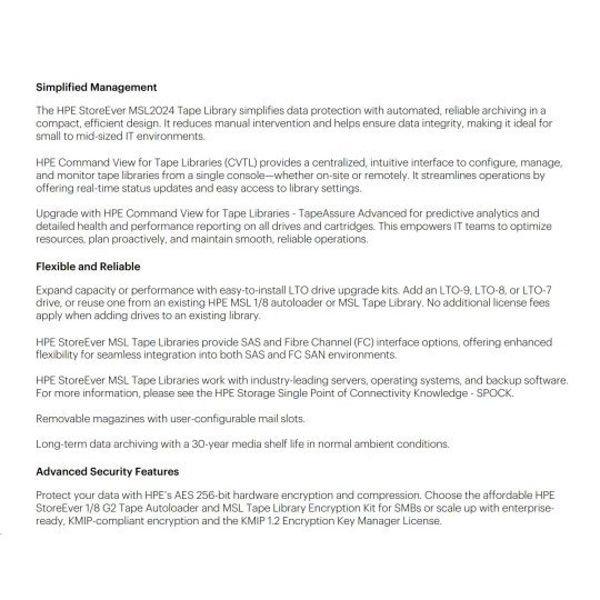 HPE Storage MSL2024 Tape Library 1x MSL LTO-8 Fibre Channel 15x LTO-8 30TB Data Cartridges.