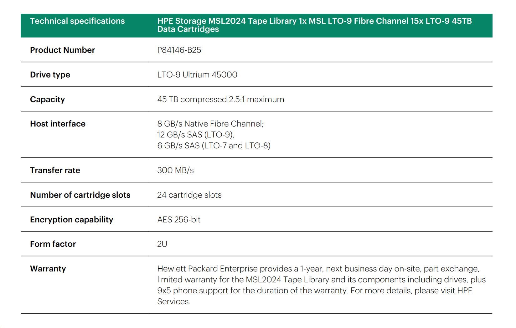 HPE Storage MSL2024 Tape Library 1x MSL LTO-9 Fibre Channel 15x LTO-9 45TB Data Cartridges