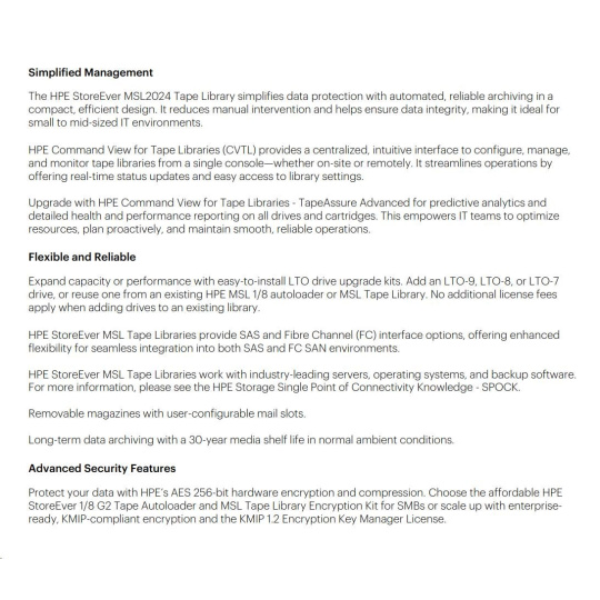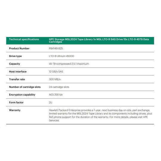 HPE Storage MSL2024 Tape Library 1x MSL LTO-9 SAS Drive 15x LTO-9 45TB Data Cartridges.
