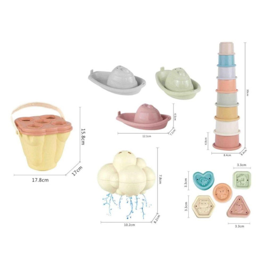 Sada hraček do vody 5v1 v praktickém kyblíku promění každou koupel v zábavnou hru. Lodičky, kelímky a obláček, uložené v kyblíku, který je současně i vkládačkou, se postarají o to, že koupání ve vaničce, vaně nebo v bazénku nebude nuda. K nabírání vody, přelévání a polévání poslouží stohovací kelímky s čísly nebo kyblík, na vlnách se pohoupou barevné loďky a z obláčku zaprší vždy, když se naplní vodou..