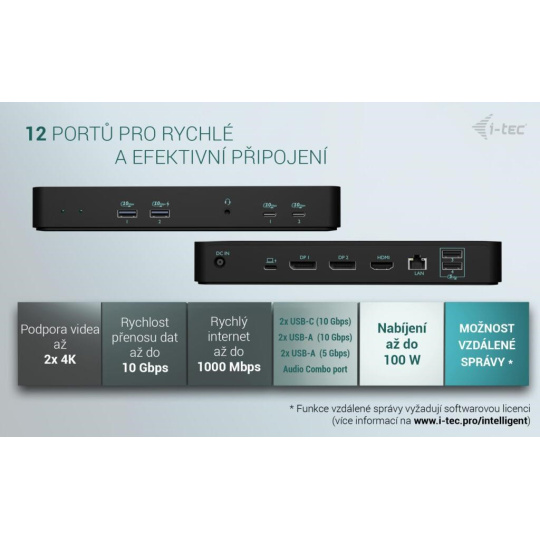 • Tato výkonná a univerzální dokovací stanice je vybavena dedikovaným LAN portem, který umožňuje plnou vzdálenou správu – až na úroveň jednotlivých portů – odkudkoliv. Správa funguje i bez připojení k hostitelskému zařízení – stačí napájení a připojení do LAN.
