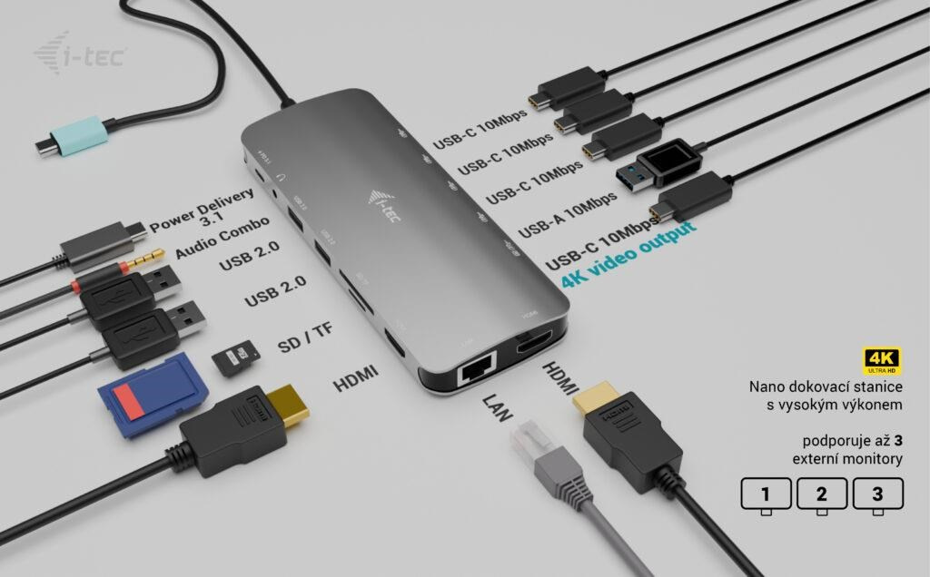 • Malá, ale výkonná kovová dokovací stanice USB-C, ke které lze připojit až tři externí monitory