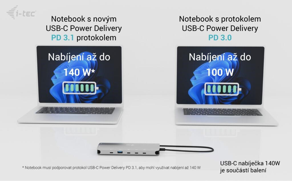 ** Pokud váš notebook nebo tablet podporuje nový a moderní nabíjecí protokol USB-C Power Delivery PD 3.1, dokovací stanice nabídne nabíjecí výkon až 140 W (pokud máte protokol PD 3.0, nabíjecí výkon bude až 100 W).