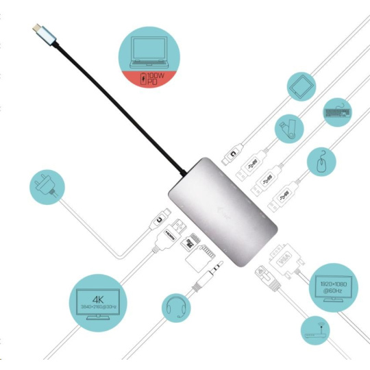 - Dokovací stanice podporuje až 100 W napájení připojenému notebooku nebo tabletu