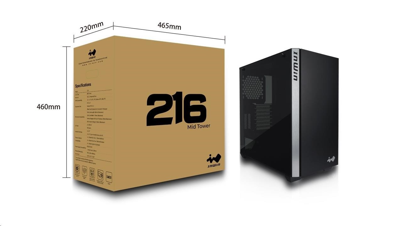 IN WIN skříň 216, mid tower, 220mm PSU, 166mm fan,, 2xHDD, 5xSSD, 2x USB 3.0 / HD Audio / Black