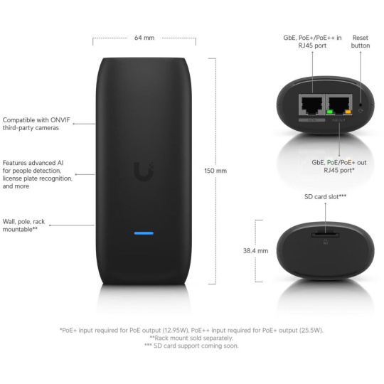 Popis produktu AI zařízení, které rozšiřuje funkce jakékoliv UniFi Protect kamery nebo kamery třetí strany o schopnosti detekce, klasifikace a rozpoznávání pomocí umělé inteligence. Zařízení lze montovat na stěnu nebo trubku s průměrem alespoň 45mm Každý AI-Port podporuje právě 1 kameru třetí strany nebo kameru UniFi Protect G3/G4/G5. V budoucí verzi firmware bude podporováno více kamer. Kamera nemusí být připojena přímo do AI-Portu, je potřeba aby byla ve stejné síti LAN a páruje se s AI-Port v aplikaci Protect. AI-Port je možné napájet přes vstupní POE 802.3af/at/bt. V případě vstupního napájení 802.3at lze navíc využít PoE výstup s výkonem až 12.95W, v případě vstupního napájení 802.3bt lze využít výstup s výkonem až 25.5W. AI-Port přináší do všech kamer AI funkce: • Detekce: Pohyb, člověk, vozidlo, domácí mazlíček, řeč • Klasifikace: Barva vozidla, typ vozidla • Rozpoznání: Obličej, registrační značka Podpora více kamer * • ONVIF 2K: až 2 kamery • ONVIF HD: až 3 kamery • UniFi Protect: až 5 kamer * podpora více kamer je plánovaná v budoucí verzi firmware Obsah balení • Zařízení • Držák na zeď / trubku • (2) Stahovací pásky • (2) Vruty a hmoždinky  Technické parametry Napájení Napájení přes PoE:Ano Počet PoE In portů:1 Typy PoE:PoE-Out + PoE-In Podporované PoE-Out standardy:802.3af, 802.3at Počet PoE Out portů:1 Fyzické charakteristiky Tlačítka:Reset Provozní teplota [°C]:-20 až 40 Hmotnost [g]:258 Šířka [mm]:64 Výška [mm]:150 Hloubka [mm]:38.