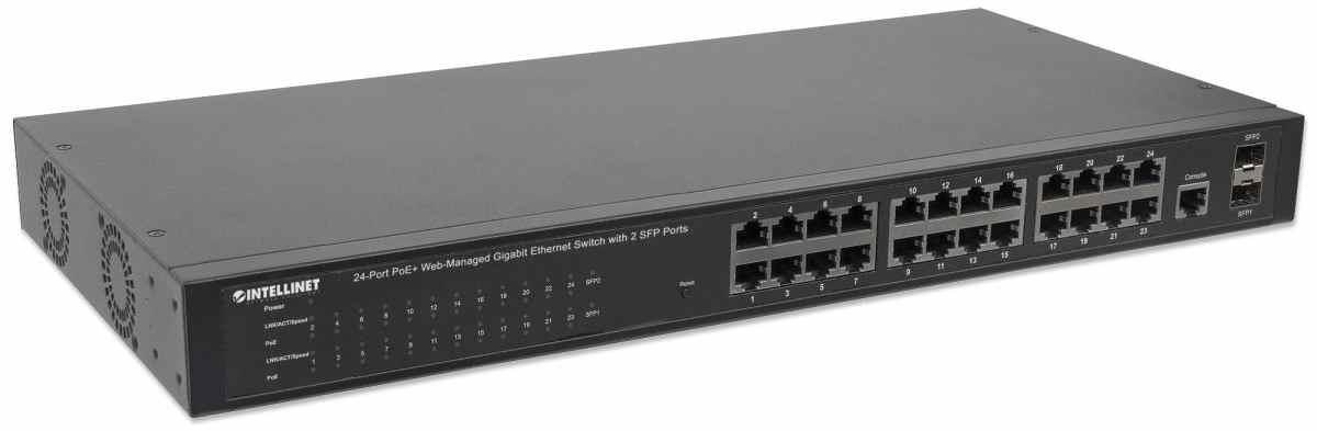 Intellinet 24-Port PoE Web-Managed Gigabit Switch with 2 SFP Ports (180 W), 24 PoE+/PoE ports 802.3at/af
