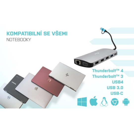 • Dokovací stanice je kompatibilní s téměř jakýmkoli současným notebookem (připojení přes porty USB 3.0, USB-C, USB4 nebo Thunderbolt™ 3/4).