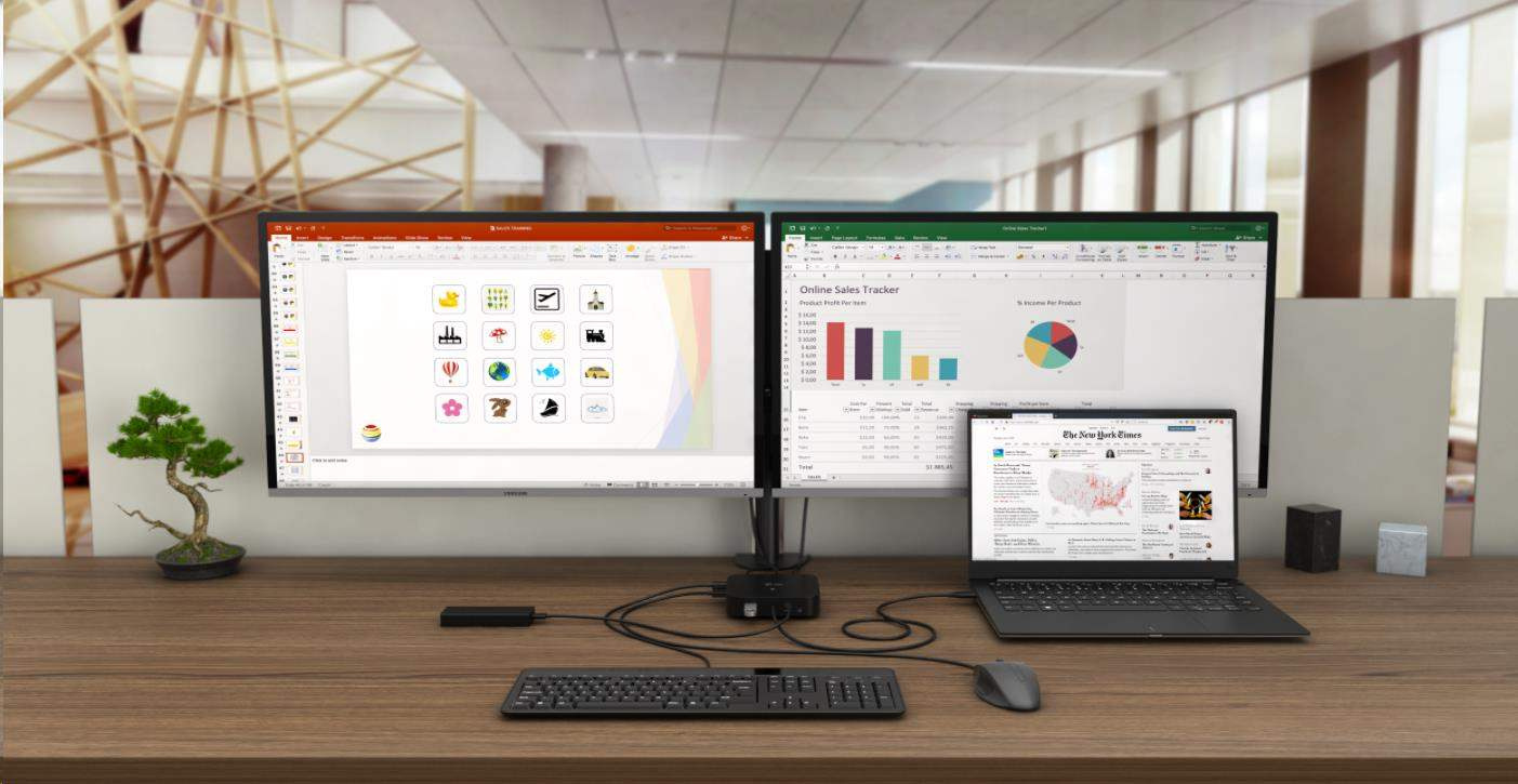 Kancelářská dokovací stanice USB-C, která podporuje až 2x externí monitor v rozlišení 4K. Stanice je kompatibilní s jakýmkoliv notebookem vybaveným portem USB-C nebo Thunderbolt 3. 6x USB port, spolehlivé a rychlé připojení do podnikové sítě díky integrovanému LAN portu, napájení až 100 W a podpora instalace za monitor, to vše z této dokovací stanice dělá ideálního společníka pro profesionály.