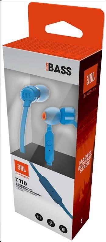 JBL T110 Black špuntová sluchátka, 3,5 mm jack, mikrofon, modrá