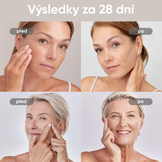 • Viditelné výsledky za 28 dní – klinicky ověřený účinek. Testy prokázaly redukování vrásek o 20 %, zlepšení jasu pleti o 24 %, zvýšení pevnosti o 16 % a redukci tmavých skvrn o téměř 30 % již po čtyřech týdnech pravidelného používání.