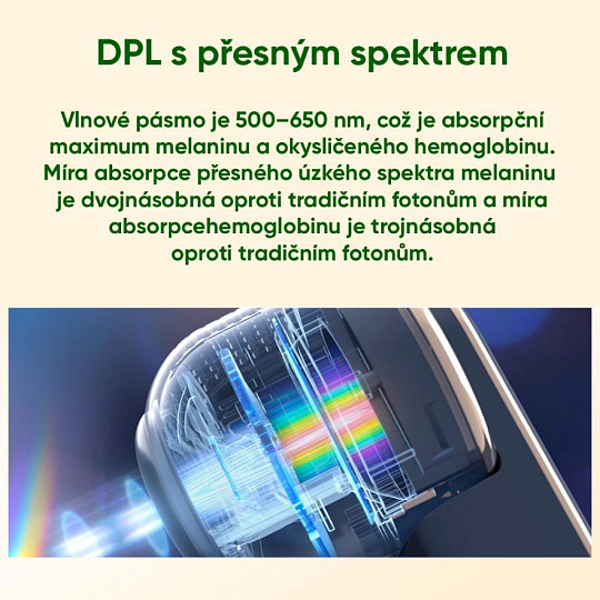 - Vyšší účinnost než IPL: DPL technologie má 2x efektivnější absorpci melaninu a 3x efektivnější absorpci hemoglobinu než tradiční IPL.