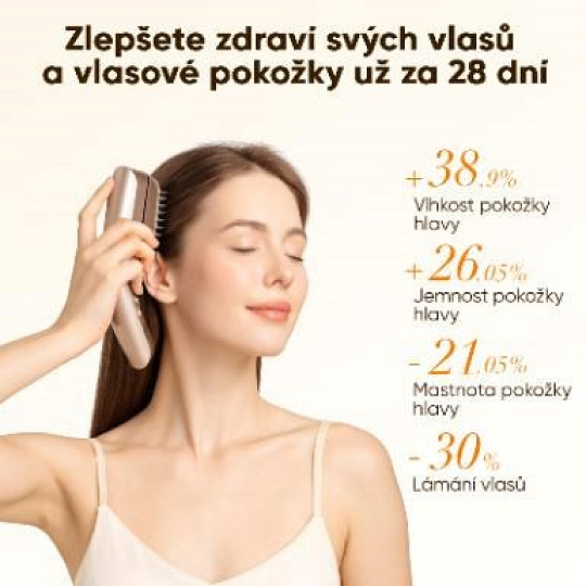 - Péče o vlasy a pokožku hlavy: Speciální hřebenový nástavec a sérum zpevňují pokožku hlavy, omlazují vlasové folikuly a bojují proti vypadávání vlasů.