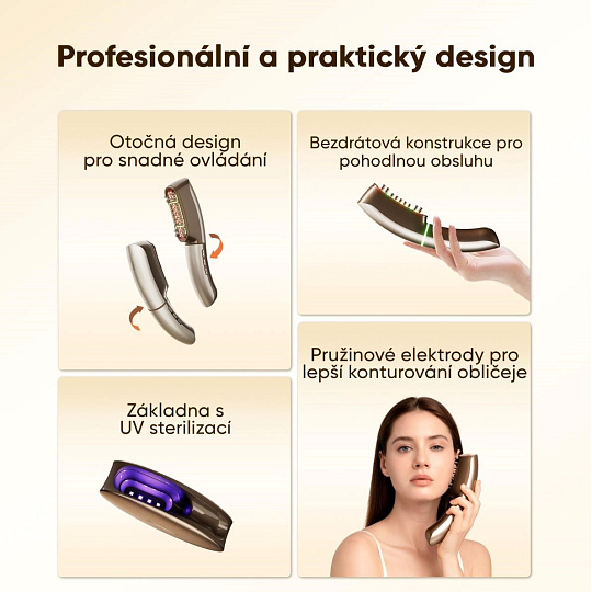- Prémiový design a hygiena: Otočná hlavice , pružinové elektrody a bezdrátové provedení s UV dezinfekční základnou.