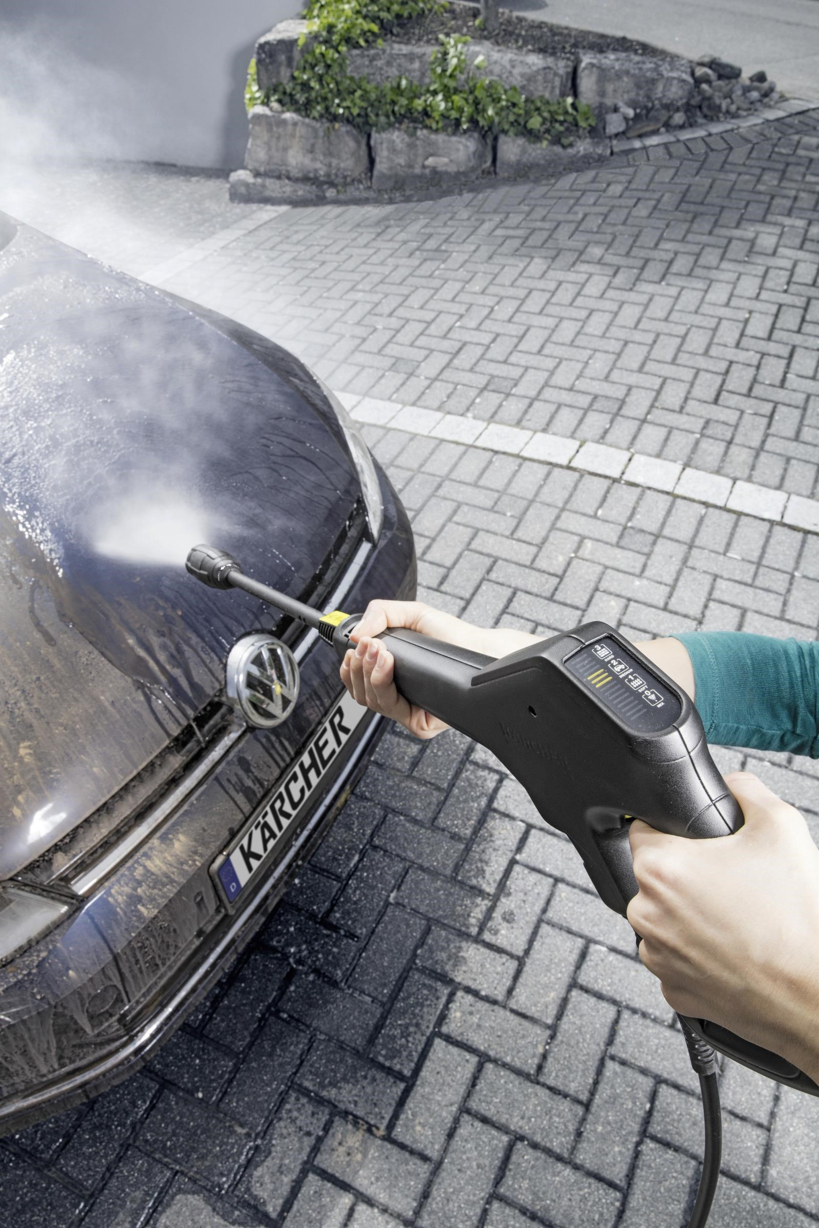 Díky praktickému aplikačnímu poradci v aplikaci Home & Garden zajišťuje Kärcher ještě lepší výsledky čištění - a z uživatele dělá profesionála v úklidu. Aplikace také nabízí komplexní servis včetně informací o zařízení, aplikaci a servisním portálu Kärcher. Vhodnou úroveň tlaku lze nastavit a zkontrolovat na displeji spouštěcí pistole - pro maximální kontrolu a ideální tlak na každém povrchu..