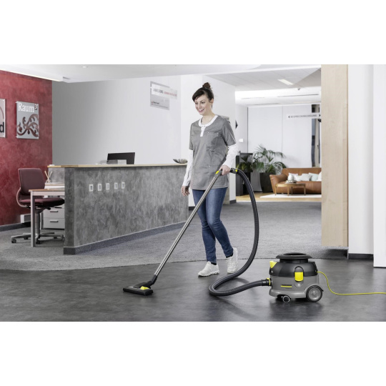 Bytelný vysavač T 12/1 spolehlivě vyčistí odolnou špínu z koberců i tvrdých podlah. Při vysávání nadělá minimum hluku (60 dB), takže se skvěle hodí do hotelů, restaurací i maloobchodu. Přístroj o příkonu 700 W vyvine podtlak až 22 kPa, kterému neodolají ani hrubé nečistoty. Důmyslný 6násobný filtrační systém zajišťuje hygienické odstranění prachu a dlouhou výdrž vysokého sacího výkonu. Omyvatelný filtrační koš umožňuje vysávání se sáčkem i bez něj. Na požádání k vysavači dodáváme také kvalitní HEPA filtr pro ještě lepší výsledky. Vysátý odpad se ukládá ve velké 12l nádobě odolné vůči nárazům. Komfort při úklidu zaručí dlouhý 12m přívodní kabel a ergonomická rukojeť vysavače. Přístroj snadno zapnete i nohou a díky čtveřici pogumovaných koleček lehce přesunete kamkoliv je třeba. A když se vše leskne čistotou, kabel, hubici i sací trubky jednoduše uchytíte k tělu vysavače, takže ušetříte místo na skladování.