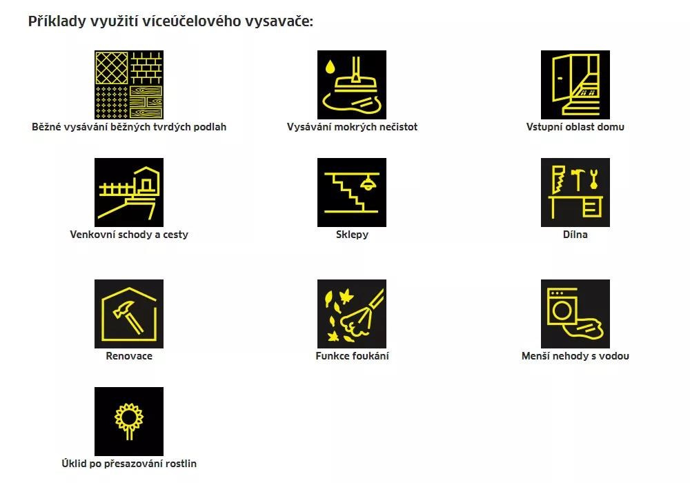 mokré, jemné nebo hrubé nečistoty se spotřebou 1100 wattů. Zařízení je dodáváno s robustní plastovou nádobou o objemu 25 litrů, 5metrovou šňůrou, 2,2metru dlouhou sací hadicí s odnímatelnou,