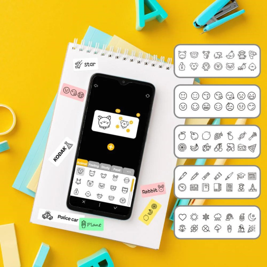 Návrh etiket s textem a emotikony v aplikaci KODAK MEMO. Připojte se přes Bluetooth a tiskněte své vlastní etikety kdykoliv a kdekoliv.