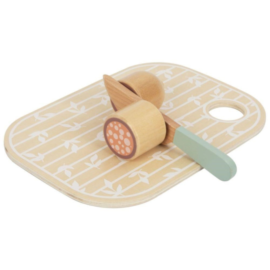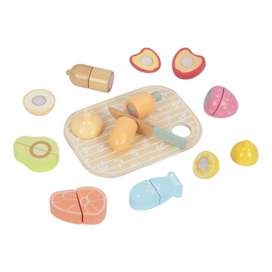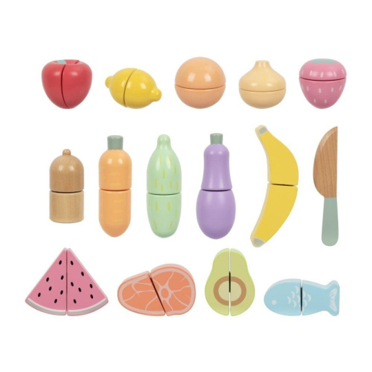 Sada dřevěných krájecích potravin uložená v praktickém a snadno přenosném boxu 3v1 umožní dětem přichystat hostinu doma i na návštěvě. Krájecí ovoce, zeleninu a další potraviny mohou děti pomocí dřevěného nože krájet (porcovat) na poloviny a pomocí suchého zipu poloviny opět spojovat. S krájecími potravinami si děti vyzkouší krájení bezpečným dětským způsobem a zdokonalí své dovednosti..